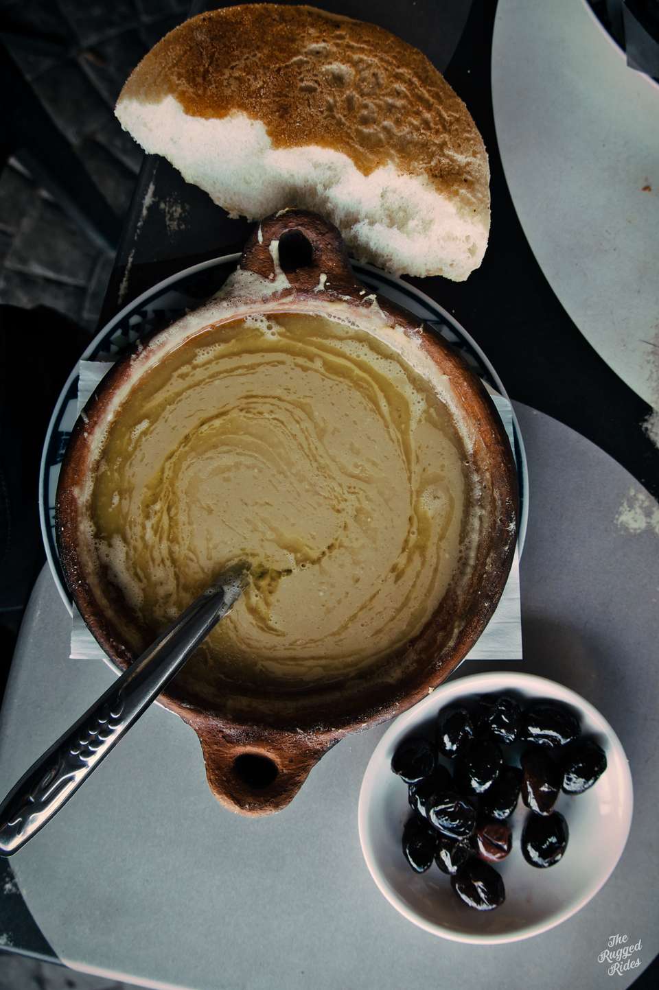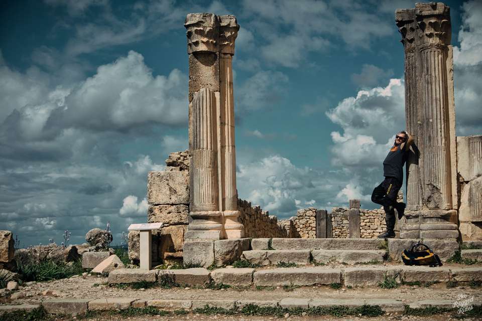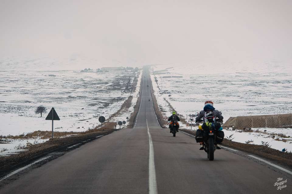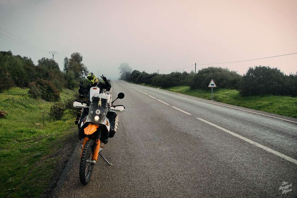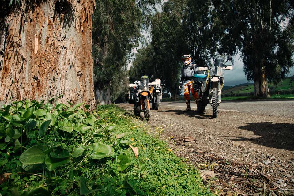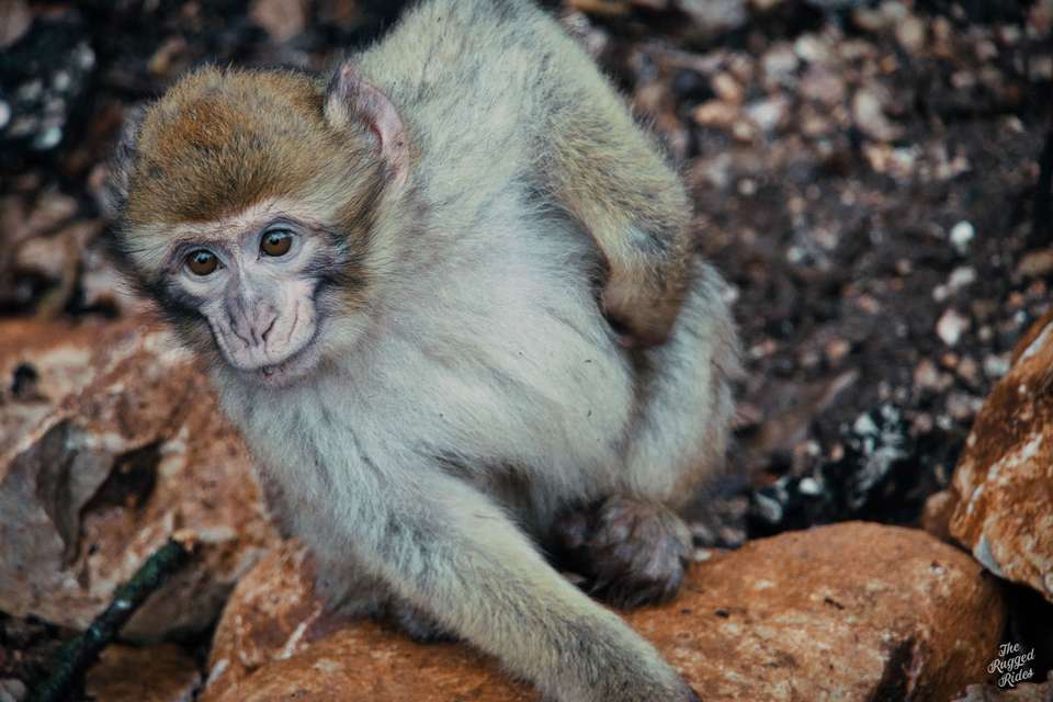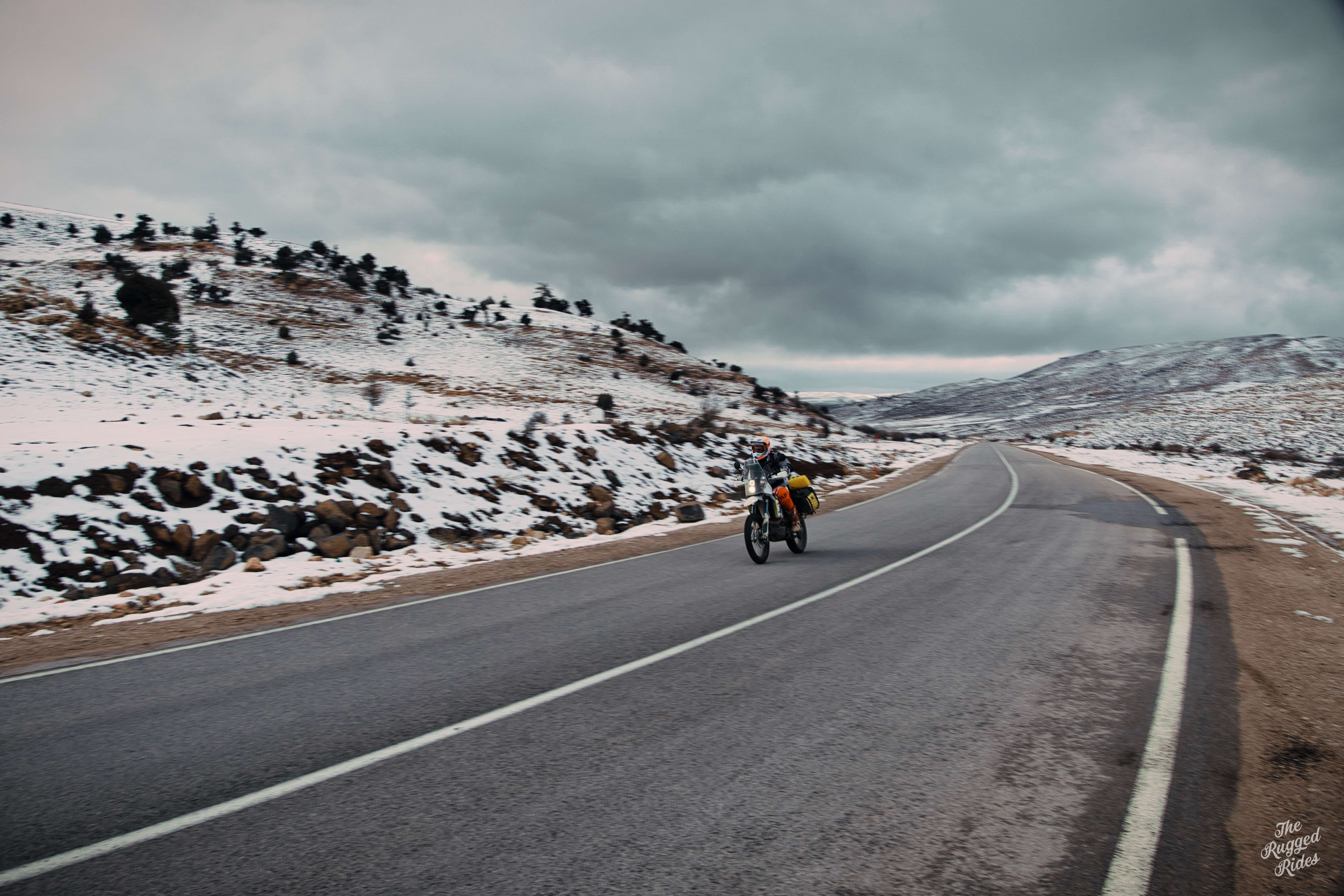 Second day, we plan to reach the trailhead today. In the morning, we don't really know what awaits us in the mountains, but we see the first landscapes of Morocco, the evergreen Rif mountains, ancient Volubilis, we find some Hssoua soup, some tajin, we change money, so just an ordinary termac ride, nothing special to talk about... Until we meet some monkeys at the roadside. The snow is reflecting in their eyes. From now on, we catch a bit more altitude and ride in permanent snow, the temperature does not drop below zero, but there are many kilometres to click. The week before, Morocco had been hit by some sort of severe climatic disaster, everyone was writing about it and people were trapped often in places where they had been snowed in. At first we are quite happy with that, taking photos, but as time went on I began to wonder how much we could take of such a ride. Planning the trip, we obviously took this circumstance into account, but hey, we're going to the Sahara! 🙂 By the way, once again I am reaffirming my opinion that the layered apparel for a bike is way better than classic jackets. A high-quality down jacket over chest protector and a decent membrane jacket outside is superb.