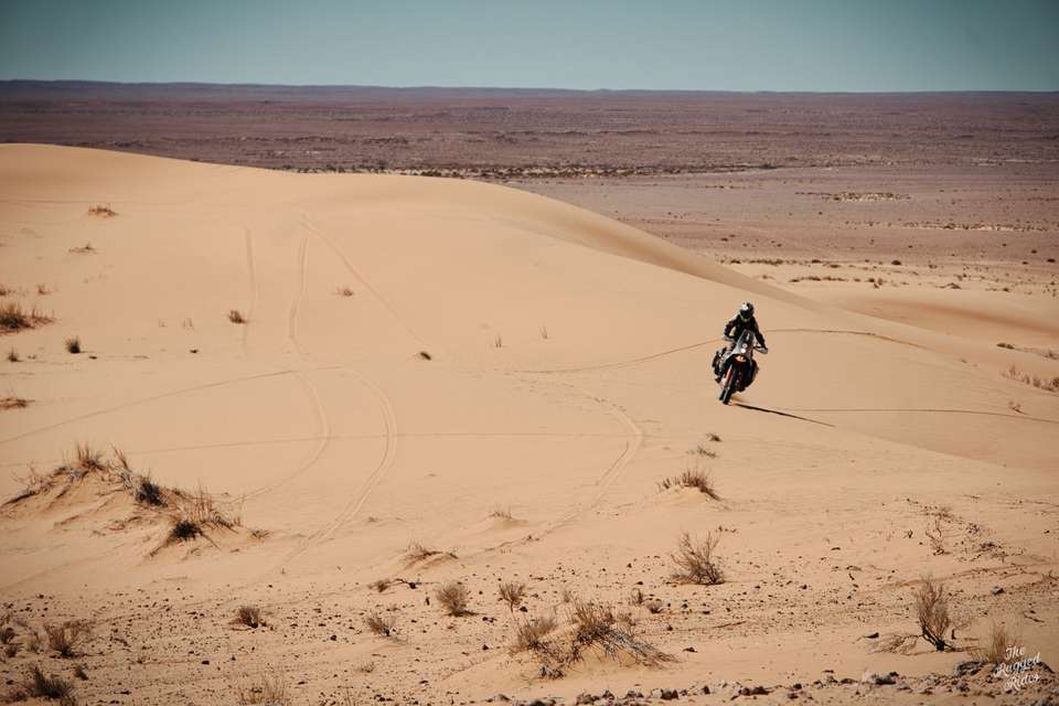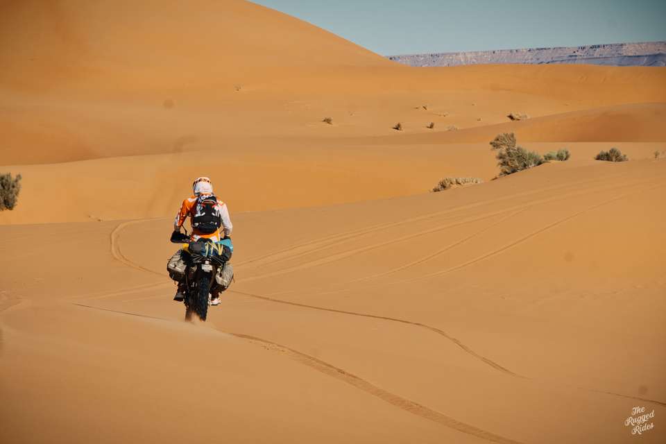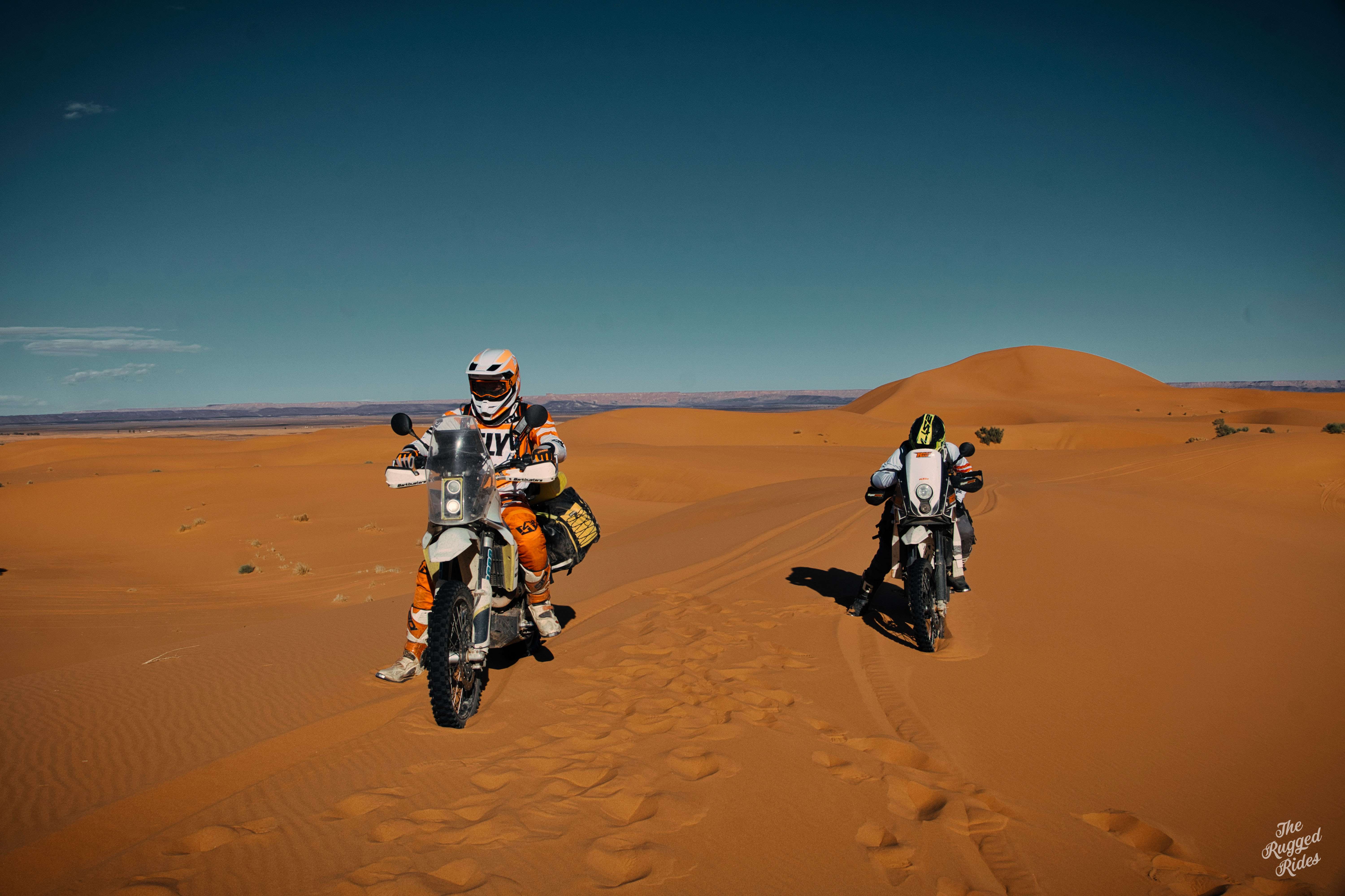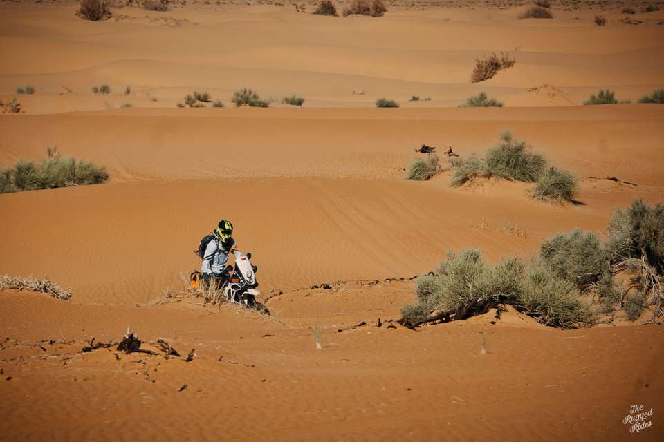 Suddenly, we reach the dunes at Merzouga, that was quick! We stop, agree that this is only the beginning of the trip, that there will be time for playing around in the sand, that for now we just have to cross this swathe of dunes, keeping an eye on each other. I'm also not sure how Greta will cope, she has nearly 30 litres of fuel and luggage onboard. We set off, but I'm feeling somehow uncomfortable. So in order to remove the spell I decide to push it really hard. Next moment I get a massive high-side and land face down in the sand. I move on immediately, as this is the best way not to give up and start riding too conservatively. It works, I set the steering dumper stiffer a bit and turn towards the high tops of the dunes. Here we go... :-) About an hour later I try to call Kuba on the radio, he's somewhere behind the two dunes on the left, Tom and Piter are down below and I'm standing next to Greta, knocked aside, on the slope of a huge dune. I'm finding it hard to catch my breath but under my helmet I'm laughing to myself almost out loud. What magic is there in these piles of sand that they so easily charm a man? Ok, but we need keep going! We are going to set up the first bivouac, the sun sets almost suddenly and so the last clicks we have to cover in the pitch dark....