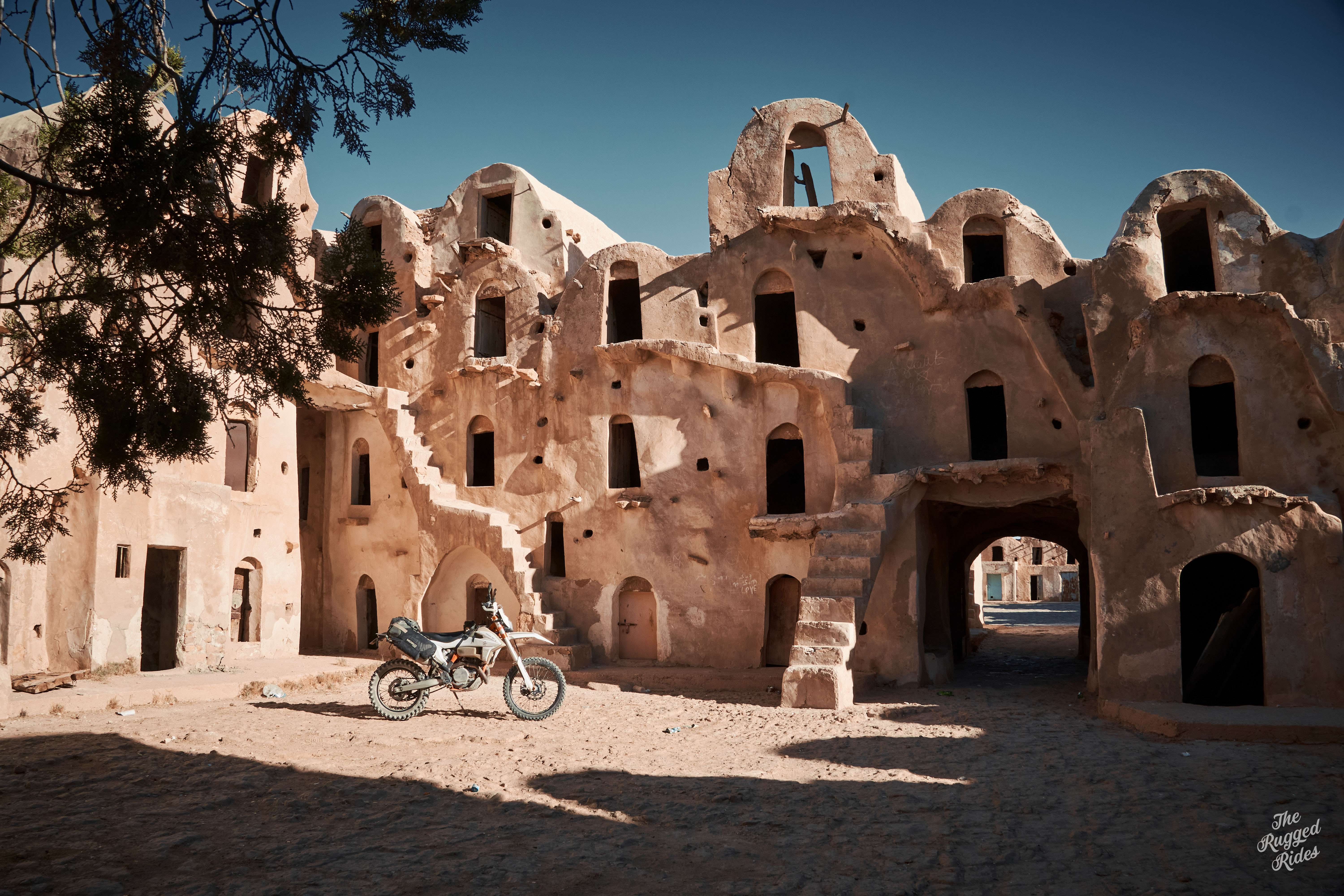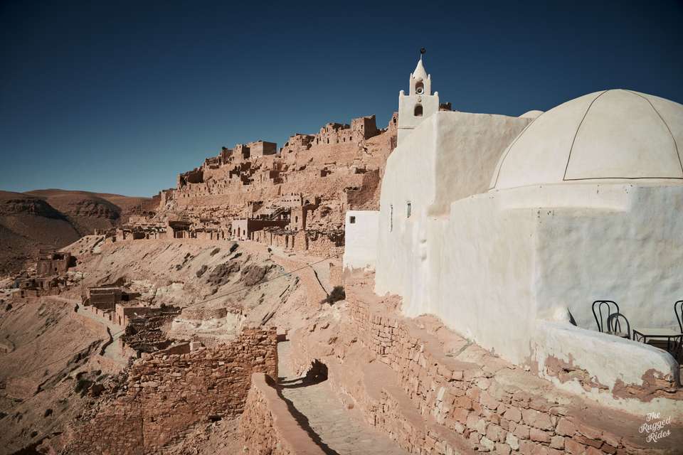 Southeastern Tunisia is mostly wide-open desert valleys, endless rocky tracks, and lots of Ksars. These are fortified villages typical for Berber culture, often used as storage for food and valuables, places of refuge in times of danger, and hubs of local trade and community life. They're made up of so-called ghorfas, small storage rooms stacked on top of each other, sometimes up to five stories high, with no windows and tiny doors. Each ghorfa belonged to a merchant who stored their goods there.